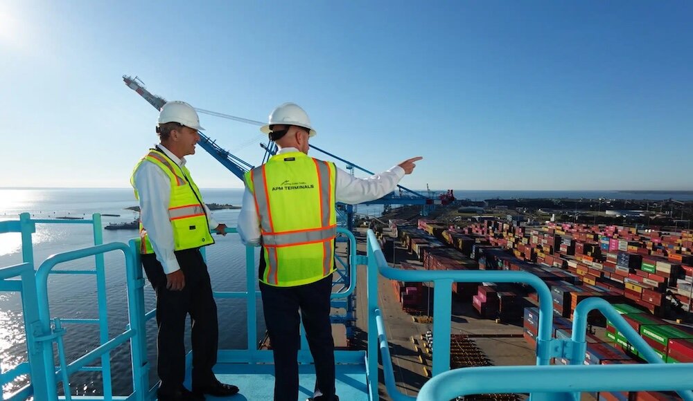 Doug Otto and APM Terminals’ Brian Harold view on-going port projects from atop one of the port’s gantry cranes.