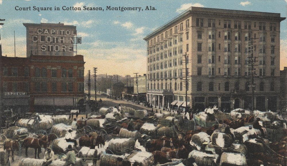 A postcard from the turn of the 20th century depicts cotton wagons in Montgomery. Courtesy of the Alabama Department of Archives & History.