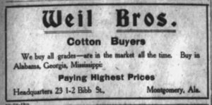 They established offices in a multi-story building on Bibb Street. From there, the company bought thousands of bales of cotton, some in smaller batches from farmers crowding Montgomery’s Court Square, and even more from larger-scale producers, purchasing entire harvests at once and arranging transport directly from the farm to a warehouse. In one 1906 transaction, for instance, Weil purchased 3,000 bales from an Andalusia man for $200,000 (roughly $7.1 million today).